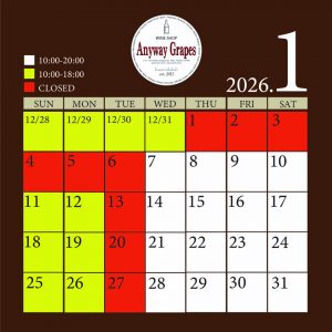2026年 1月 営業日のご案内:火曜定休 ※ 1月1日(木) ー 1月6日(火) 正月休み ワイン暦 2025年12月28日 Anyway Grapes 2026年 1月 営業日のご案内 火曜日 定休日 日・月 OPEN 10:00 – CLOSE 18:00 水〜土 OPEN 10:00 – CLOSE 20:00 1月1日(木) ー 1月6日(火) 正月休み 1月7日(水) より通常営業 お知らせ
