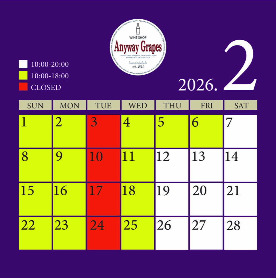 2026年 2月 営業日のご案内:火曜定休 ワイン暦 2026年1月26日 Anyway Grapes 2026年 2月 営業日のご案内 火曜日 定休日 日・月・水 OPEN 10:00 – CLOSE 18:00 木〜土 OPEN 10:00 – CLOSE 20:00 お知らせ
